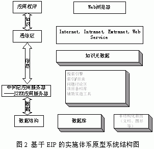 有关文献表明,企业信息门户(Enterprise Information Portal, EIP)是实现知识管理的最合适的技术[6]。从知识管理系统的角度来看,EIP是Intranet进化的结果,因为Intranet不能从不同的数据源收集数据,并且也很难将信息清晰简洁的显示给用户。图2是基于EIP的实施体系原型系统结构图。