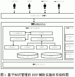 目前,ERP项目的实施成功率主要取决于实施人员的经验,同样的ERP系统,不同的实施人员实施小过可能差别很大,如何建立一个辅助实施系统,提供给实施人员、开发人员和系统应用客户一个实施工作平台,将有经验的实施专家的实施经验转化为集体的经验,是ERP供应商和ERP咨询公司都关心的一个问题。图1中给出了一个基于知识管理的ERP辅助实施体系。