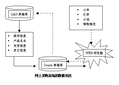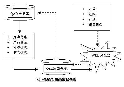 此系统包括了9个基本模块:通知公告的网上发布、与销售有关部门的基本情况介绍、与销售有关的基本知识的介绍、与销售有关部门制定的政策法规的介绍、动态商情的介绍、日常交易的网上实现、总公司对经销商反映意见的回复、经销商之间的经验交流、产品目录、维修站目录、代理商目录、银行账户等基本信息的网上发布。 在进行交易之前,经销商可以通过"可发车库存查询"和"资金余额查询"功能,查询总公司的可发车库存(来自QAD库存数据)和经销商本身的应收帐余额和汇票余额等信息,用于决定是否向总公司发货及是否需开出汇票。随后,经销商通过“收彻地点输”功能,维护货物发往地点的信息。此地点将随着订单一起导入QAD系统,总公司运输部门将整车送致此地点。然后,经销商使用"汇票输入"维护汇票信息,同时可以使用"汇票查询"查询所有开给总公司的汇票信息,在以上工作完毕之后,经销商就可以使用"订单输入"功能,输入订货合同。总公司收到此合同后,经过确认,将订单导入QAD系统,总公司内部开始整车发运流程。整个发运流程都将通过"订单查询"报表发布给经销商,经销商还可以随时查看整车发运过程的实时进展。经销商还可以查询总发车明细、开票明细等信息。在此系统中,还包括“车辆用户档案输入与查”"计划输入与查询"、"经销商库存及销售报表输入与查询"等功能。 由此,总公司与代理商的关系从松散变得紧密。该系统将分布在全国各地的经销商每天的经营情况,包括订单、汇票,计划等通过网络准确、自动地汇总到总公司的数据库,实现企业内部数据汇总和自动化。总公司可以通过网络对代理商发出指令,或对其业务活动进行指导。 另一方面,江铃又利用QAD的数据库和Oracle数据库的结合,将总公司内部QAD管理系统提供的信息与供应商提供的发货信息进行迅速传递和交流,实现了高效益的在线采购。(请参见示意图)