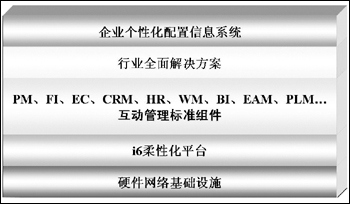 在第二层的“i6柔性化平台”中,李伯鸣强调这是一个基于系统级的统一平台,“非常灵活,包含应用服务、工作流引擎、消息机制和一些类库。”在第三层的“互动管理标准组件层”中,URP的各功能模块均集成在此。“重要的是,这一层是开放的,别的厂商也可以使用或加入一些标准的组件。”