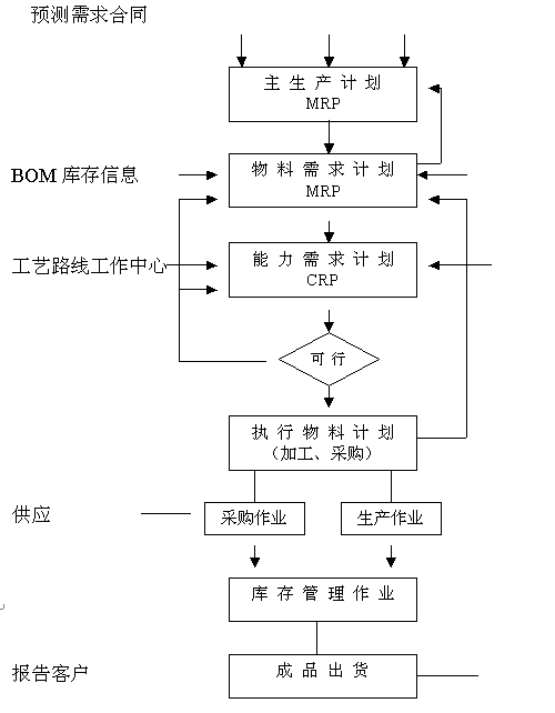 50年代开始提出MRP的概念。MRP从字面上解释为物料需求计划(MaterialRequirementsPlanning),此为基本MRP阶段。其目的是为了解决物料何时定货以及订货数量问题。到了70年代加入生产能力需求计划、车间作业计划和采购作业计划,形成闭环MRP阶段(CLOSE-LOOPMRP),其工作过程是"计划--实施-评价-反馈-计划"的封闭循环过程。到了80年代,人们把生产、财务、销售、工程技术、采购等各个子系统集成为一个一体化的系统,并称为制造资源计划(ManufacturingResourcePlanning),即MRPII。MRPII系统具有如下特点: