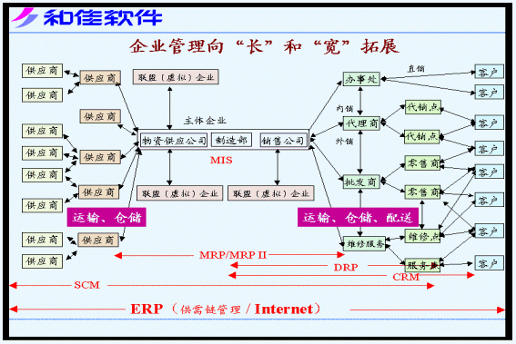 计划经济时期,企业管理的范围局限在企业内部,包括采购、生产、销售,只要按照上级主管部门的计划要求,按时完成任务,企业就是好企业。我们国家在计划经济向市场经济转型过程中,企业不同程度地面临市场竞争的压力,逐渐意识到企业的生存必须依靠市场,所以,除了在产品开发、产品结构调整、技术改造上投入很大力量外,在企业管理中逐渐加强了对销售系统的关注,建立外地的分公司、办事处,组建批发商、代理商、经销商队伍,建立与客户的联系渠道和档案等等。随着市场的不断扩展,生产和供应也需要适应市场发展的要求,与供应商、协作单位及合作伙伴的联系和管理得到了加强。因此企业由内部的供、产、销、人、财、物管理,发展到目前的对客户的客户及供应商的供应商进行管理,企业管理在“长”和“宽”上进行了扩展。这种扩展完全是为了适应市场竞争的需要。