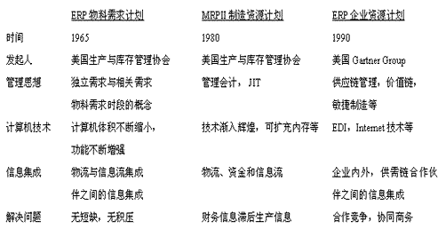 基于关系的治理体系初始成本低,是一项“中国奇迹”,如蓬勃发展的早期的乡镇企业、私营企业,我国农村改革的“包产到户”,“包干到户”等等。在交易量低的情况下,这种管理体系有其优势。 对我国大中型国营企业而言,其交易量或经营伙伴数量大大高于临界点。这种基于关系的治理体系所带来的问题也就是我国公司治理中存在的一些主要问题,如“多级法人制”的存在,其结果是资金分散、内部利益冲突、“利益转送”等等一系列后果。 由此,我国大中型国企的改革,必须建立一套基于规则的治理体系。这套基于规则的治理体系完全可以通过实施ERP,走企业管理信息化的道路来实现。 2.企业管理信息化定义 企业信息化是采用先进的管理理念,应用先进的计算机网络技术,按一定的规则整合企业的生产、经营、制造、管理等,以便对外界需求作出迅速反应,从而加强企业的生存力与竞争力。企业信息化分两条线。一条是以计算机为辅进行设计、制造、工程等的技术主线,另一条是以物流、资金流带动信息流为主的管理主线,也就是本文所讨论的主要内容。 3.ERP是企业管理信息化的重要组成部分 企业管理信息化中提到的先进管理理念是什么呢?答案是企业资源计划,即EnterpriseResourcePlanning(ERP)。ERP的发展大致可以分为三个阶段,见下图比较表。