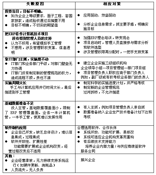 为了使更多的企业成功实施ERP ,有必要总结和分析某些企业ERP实施失败的原因,并提出相应的对策。试用下表一一列出。
