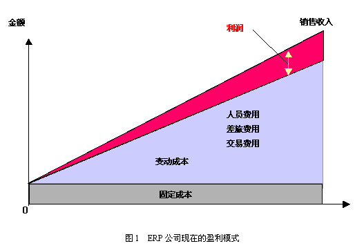 ERP产品是由实施人员通过培训,将其中的管理理念、管理技术、管理方法知识转移给企业的使用者,某种意义上讲,实施人员是ERP产品的第一“用户”。如果产品不“易实施”,实施周期就长、实施成本就高,软件公司就不可能盈利,始终会在行业公认的恶性循环中摆脱不出来,不管你现在有多少钱,迟早有一天会花完。因此“易实施性”是我们这个行业改变经营模式,实现盈利的决定性因素。我们看下面两张图: