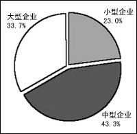 2003年第一季度,中国ERP软件市场垂直市场结构见图1。ERP软件的目标市场主要集中于大中型企业。2002年第一季度,大型企业市场是最大的垂直细分市场,而2003年第一季度的数据显示,中型企业所占比重达到43.3%,超过大型企业市场,成为最大的垂直细分市场。而为数众多的小型企业还未成为ERP软件需求的主要力量。
