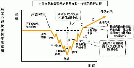 第八卦:变革管理 上面讲道。首先在上ERP前,企业家必须要有一个真正的危机感,他必须认识到不上信息化就没有办法在生存下去。第二必须要有足够权利的项目企划人,项目负责人,他必须要有足够的权利。第三要有一个非常清晰的远景。第四必须要把这个远景贯彻落实到企业的基层,而且必须要有能力消灭实现远景过程中存在的障碍。必须改革企业内部的文化。实施ERP通常是一次大的变革,我公司为此拥有一套咨询的思路和方法帮助企业来实现变革。 这里最重要的是明白企业上下层在实施ERP项目过程中所经历的心理状态的转变,以下图片正描述次心理曲线。  从不了解盲目的乐观,到慢慢的觉得很烦,影响到了日常的工作,觉得很烦,心态情绪越来越低,甚至走到绝望,很多ERP项目就是这么走到绝望后再也没有办法再继续投入。所以变革管理就是告诉我们怎么样通过有效的交流把这个绝望的低谷A最小化,然后通过深入的培训提高个人以及团体的能力,使B最小化。设计完善的转变架构和流程,建立项目绩效考核体系使C/D最大化。 太极八卦讲究的是天地定位,山泽通气,雷风相薄,水火不相射。八卦相错,数往者顺,知来者逆,是故易逆数也。有天地,然后万物生焉。通过太极八卦我们可以更加周全的规划企业信息化工作。我希望企业家们能够通过对以上所讲述的八大成功要点,调和企业上下、内外、前后业务,摆好你们的ERP八卦阵,真正地做到运筹帷幄,决胜千里! |