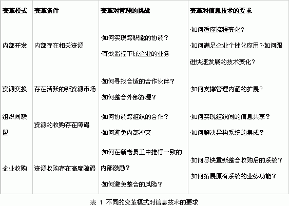首先,从变革的过程来看,集团化是任何一个希望做大做强的企业必然经历的过程。企业的变革模式主要有四种,即内部开发模式、资源交换模式、组织间联盟模式、企业收购模式。这四种变革模式各有其独特的优势,同时又面临着不同的风险,但是都对信息技术提出了自己的要求。如下表所示: