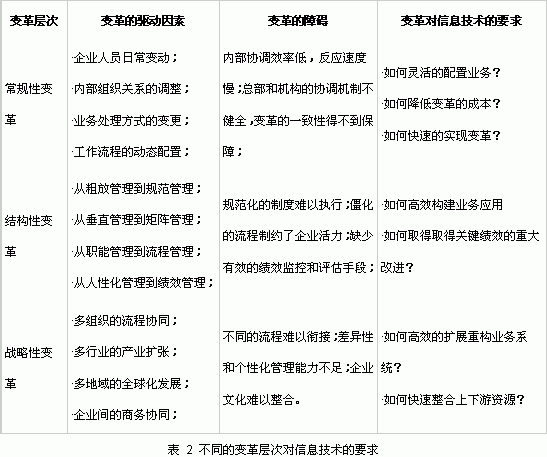 今天,大企业的CEO比中小企业的老板显然面临着更大的压力。在竞争日益激烈,市场变化速度不断加快的今天,集团企业CEO发现他们面临的最大挑战已经不是传统的管理职能,而是如何领导变革,因为变革决定了企业的可持续发展,变革是应对竞争和市场变化的唯一出路。而在集团企业的变革管理中,信息技术正在发挥越来越重大的作用,不同的变革道路,不同的变革模式,不同的变革层次都对信息技术的应用提出了挑战。