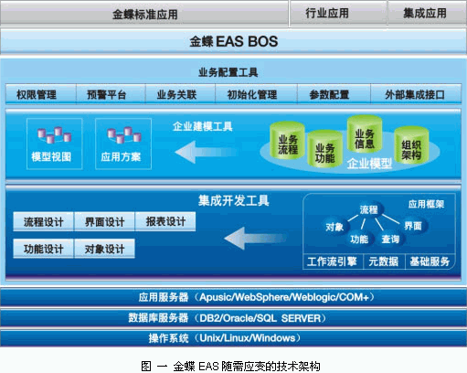 金蝶EAS正是凭借独有的基础中间件和业务中间件技术从下到上实现了管理软件的随需应变的技术架构,见下图所示: