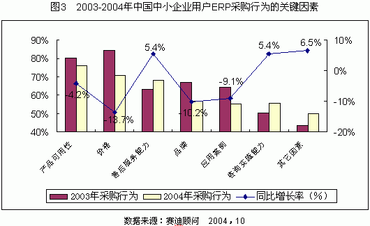 | | 赛迪顾问最新研究结果表明,中小企业ERP市场增长率连续两年超出大型企业ERP市场增长率,成为拉动ERP市场增长的主导力量。中小企业用户对ERP产品需求旺盛,未来三年将是中小企业ERP市场快速成长的关键性时期。中国中小企业ERP市场即将进入普及时代,ERP软件的可用性、价格以及售后服务能力已经成为中小企业选型最为关注的三大因素。在中小企业市场,价格适中、能够快速实施的ERP产品必将主导市场。 中小企业继续成为拉动ERP市场增长的主导力量 2004年,ERP软件在中小企业市场得到了进一步应用和发展,销售额有了较大幅度的提升。中小企业ERP市场销售额已经占到了ERP整体市场的69.8%,比2003年提升了1.6个百分点。中小企业ERP销售额同比增长率达到30.4%,大幅超过了大型企业市场20.9%的增长率,是大型企业市场增长速度的1.5倍。2004年,中小企业市场继续成为拉动ERP市场实现快速增长的主要动力。2003-2004年中国ERP软件市场销售额与增长率如图1所示。  未来三年将是ERP市场快速成长的关键时期 2004年,赛迪顾问对年销售额(或资产)在500万到5亿元之间的中小企业IT采购行为进行了调研,有效样本覆盖全国七大区域40个城市以及制造、能源、流通、建筑、媒体、医药六大行业。本次调研结果表明,中小企业已经采购和正在选型ERP软件的企业占到了31.4%,1年之内采购ERP软件的企业占到了16.7%,3年之内将会考虑采购ERP的企业占到了37.5%,仅有14.4%的企业表示将会自主研发ERP系统或者3年之后再考虑采购。2004年中国ERP软件保有量与未来预期采购时间如图2所示。  由上图可以看出,中小企业用户对ERP软件产品需求旺盛,从2005年开始的未来三年,将是中小企业ERP市场快速成长的关键性时期;中小企业市场竞争将会进一步加剧,用友、SAP等领导厂商将会加大中小企业市场开拓力度,提升市场份额;此外,对中国市场虎视眈眈的微软也必将加入瓜分中国中小企业ERP市场份额的竞争中去。 产品可用性成为中小企业用户ERP选型首要因素 赛迪顾问2004年中小企业采购行为研究表明,在影响ERP选型和采购的关键因素中,ERP软件的可用性、价格以及售后服务能力分别以76.1%、70.5%、68.3%的比例成为中小企业最为关注的三大因素。2003-2004年中国中小企业用户ERP采购行为的关键因素如图3所示。  上述研究结果表明,中国中小企业用户在ERP选型时更加慎重,选型时考虑的因素不再仅仅是厂商品牌、产品价格、功能模块是否全面等表象的因素,而是会更加关注ERP产品的可用性,ERP产品是否真正适合企业业务和发展,是否真正能够满足企业现阶段和未来的潜在需求,给企业带来工作效率的提高和销售业绩的提升。 价格适中、能够快速实施的ERP产品必将主导市场 赛迪顾问2004年中小企业采购行为研究表明,有68.4%的中小企业用户可以接受价位在10万~50万元的ERP产品,仅有4.2%的用户能够接受百万元以上的ERP产品。有43.5%的中小企业用户希望ERP项目的实施周期能够控制在3~6个月之内,仅有2.3%的用户能够接受实施周期在一年以上的ERP产品。2004年中国中小企业用户对ERP软件产品的预期价格和实施周期如图4、图5所示。   中小企业用户更加关注ERP的可用性、价格、服务等因素,决定了中低端ERP市场的竞争焦点与高端行业ERP市场有所不同。在中小企业市场,价格适中、能够快速实施的ERP产品必将主导市场。同时,厂商的渠道覆盖能力和销售能力也将成为厂商产品能否快速占领市场的决定性因素。 国内外厂商加紧备战,迎接中小企业ERP普及时代的到来 与大型企业市场相比,巨大的中小企业数量,潜在而迫切的信息化需求,点燃了厂商投资的欲望。国内外厂商纷纷厉兵秣马,加紧备战,迎接中小企业ERP普及时代的到来。 用友准确的把握住了中小企业对产品适用、易用、好用的需求特点,适时的推出了U860企业应用套件,使中小企业用户可以根据自身的管理层次、信息化成熟度、行业应用特点,“按需设计”。其他国内外厂商去年针对中小企业市场也纷纷加大的力度,推出新的产品. 尽管国内外厂商在中小企业市场存在这样或那样的困惑,但都仍然在努力争取。毕竟高端市场企业数量有限,中小企业市场则是具有高成长性的未来之路。而国内外厂商所有的这些举措,最终使得中国中小企业市场的产品线进一步丰富,给中小企业更多的选择,也将给中国中小企业市场带来更多发展希望。