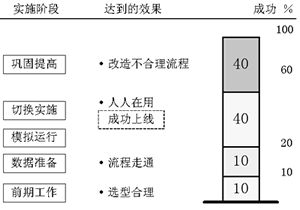 上海三菱电梯公司对ERP的成功有一个非常恰当的比喻:选对软件是成功的第一步,走通流程也只是20%的成功,做到人人在用,也就是所说的“上线”只能算成功了60%,只有学会用系统提供的信息进行正确决策,改革不合理流程,见到效应,才基本算是100%成功。