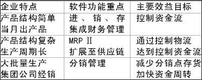 | | 一个完善的ERP系统是一个十分庞大的系统。企业选择管理软件不必追究是不是真正的ERP软件,选软件也不是按大企业、小企业来区分,我认为要根据产品特点、生产组织方式、经营管理方式的不同来选择适用的软件,见表1。  表1 根据不同企业特点选择不同的软件 软件平台的选择也与企业情况有关,总体来说,应该选用技术起点高、有发展前途的软件产品,但也不必一味追求先进性。现在一些软件商刻意宣传自己的ERP是基于互联网、界面是Web浏览器的产品。企业一方面要考查他的产品是否可靠成熟,也要看自己企业是不是跨地区的,而且有不可避免的计算机异构环境,非得建局域网不可。否则,基于局域网的客户机/服务器(C/S)为平台的ERP也是比较现实而且运行效率高的选择。