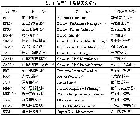 | | 2.2.2 判定管理信息化程度 企业信息化是一项革命性工程,其主要内容涵盖企业运作的各个方面,涉及到各种各样的概念,在谈信息化的文章中更是常常出现各种英文缩写,如表2-1所示。  或许上表中并未把所有有关企业信息化的概念罗列出来,但看起来已经让人有些眼花缭乱的感觉了。在这样的一堆概念下,如何来判定企业的信息化程度呢?其实所有这些概念基本上可以归结为两个方面的信息化内容,即生产技术的信息化和管理技术的信息化。每当谈到企业信息化内容时,都应该清楚所谈的是哪一个方面的内容。惟有计算机集成制造(CIMS)是这两方面信息化的集成。然而我国目前企业的发展现状向我们展示的是在生产技术和管理技术两个方面的信息化程度都还很低,应该没有多少底气来奢谈CIMS,即便是全球最发达的国家,实施CIMS的企业也是凤毛麟角。而这里的企业管理信息化程度之所指是清晰的,就是针对管理技术的信息化程度。 当然企业生产技术的信息化与管理技术的信息化会有一些联系,比如生产过程的自动化控制实际上可以自动采集生产数据,产品实现计算机辅助设计也可以直接提供规范的产品生产数据。然而,在没有完成管理技术信息化的情况下,这些数据就算拿到又能放在哪里呢?在没有完整的实现管理技术信息化的情况下,急于做接口获取这些数据又能发挥多大作用呢?一般而言,企业都可以先分别独立地考虑这两个方面的信息化实施,当达到一定的程度之后再考虑对它们进行集成。 从管理技术信息化的角度来判定您企业的信息化程度,从而确定您的企业目前需要什么样的ERP。如果您的企业目前已经完成了财务业务同步管理,也就是意味着已经完成了ERP1,则您应该朝着ERP2的目标进一步完善您的ERP,建立您的计划管理体系。同理,如果您的计划体系已经完成,也就意味着已经完成了ERP2,则您的下一个管理目标就是ERP3,建成您的整体信息化管理系统。显然,这是一个简单的原则,在实际判断中或许会有很多需要进一步辨析的状态。比如,财务业务同步管理的标志是业务产生的原始单据可以实时自动转变为财务记账凭证。如果仅仅是财务在使用计算机,采购、销售也在使用计算机,但并没有自动产生记账凭证,则或许您必须重新开始ERP1。同样,假如您的计划体系不能实现业务关联,即销售计划、生产计划、采购计划都是分别做的,并且与订单无关,则您还是应该重新开始您的ERP2。更甚者,如果您只有财务在使用计算机,可能最好的方式是对财务系统进行一定的完善,同时做好您企业的数据标准化工作和管理专业化分工,为您的企业上ERP打下一个坚实的基础。 2.2.3 定位管理瓶颈 ERP用来帮助企业管理者进行企业管理,其作用一定要体现在解决内部管理瓶颈上,为此在您上ERP时,应该分析企业的内部管理瓶颈。从大的方面来看,中国企业普遍的管理瓶颈都是在销售管理方面。究其原因可归结到我国的社会产业结构还没有一个合理的分工,致使几乎所有的企业都要面对终端客户,这种状况使得企业经营管理的首要问题一定是销售管理问题,销售管理成为企业的生死劫,而生产管理问题则不是其管理瓶颈。而如果社会的产业分工是合理的,则许多生产企业的核心问题就会转化为生产管理问题,因为此时生产企业并不需要直接面对终端用户(即直接与终端用户进行交易),他们的主要目标就是以最好的质量按时完成经销商给的产品订单。此时,生产管理、车间管理必然是其经营管理的瓶颈。所以就目前的情况而言,可能对于绝大多数企业来讲,在上ERP时都是首先考虑要解决销售管理问题,对于非生产企业就更是如此了。 这里不妨用一个企业实例来说明管理瓶颈问题。该企业是一家全国知名的白酒生产企业,在上ERP前由软件供应商对企业进行了调研。结果发现内部管理最突出的问题就是生产计划的可执行性太差,每月的生产计划约有1/3在执行的时候要发生变更。这种变化必然造成包装材料的积压和浪费(近百个品种、数千种包装材料)。同时也造成产成品积压,交货又不及时的矛盾,因为要的品种没生产出来,而生产出来的产品已经暂时不要。这个看起来是生产管理的问题,但进行了认真分析之后发现,其实仍然是销售管理问题。生产计划之所以发生改变,是由于销售订单改变引起的,该企业面对数千个经销商(当经销商的数量大到如此时,也等于是面对终端客户了),已经无法确定经销商要货的真实性,在没有信息化管理手段的情况下,每个经销商的应收款和存货已经无法核实。造成了难以控制的要货请求,乱中生变也就成为必然。 当您决定要实施ERP的时候,一定要定位您企业的管理瓶颈,应该注意绝大多数企业都只能从ERP1开始。当然不要忘记实施ERP所需要的基础,没有这个基础,就不能实施ERP,更谈不上解决管理瓶颈问题。