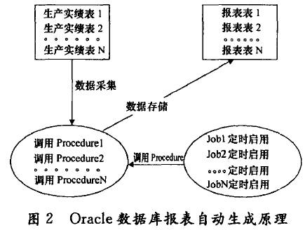 数据库系统定时启用Jobs,而每个Job又调用各个SQL脚本过程(Procedure) ;SQL脚本过程从生产实绩表中采集数据进行相应的计算后将数据写人报表对应的数据库表中。图2所示是数据库如何实现报表的自动生成。