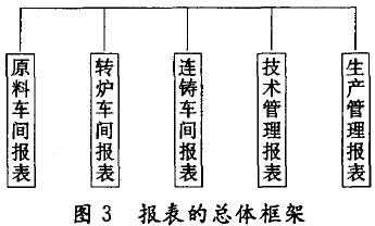 报表的总体框架为:原料车间报表、转炉车间报表、连铸车间报表、技术管理报表、生产管理报表。图3所示报表的总体框架。