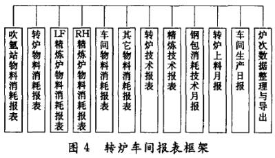 转炉车间报表包括:吹氢站物料消耗报表(单耗、总耗)、转炉物料消耗报表(单耗、总耗);LF精炼炉物料消耗报表(单耗、总耗);RH精炼炉物料消耗报表(单耗、总耗)、车间物料消耗报表(单耗、总耗)、其它物料消耗报表(报表1、报表2)、转炉技术报表、精炼技术报表(吹氢站、LF精炼炉、RH精炼炉)、钢包消耗技术月报、转炉上料月报、车间生产日报、炉次数据整理与导出。图4所示转炉车间报表框架。
