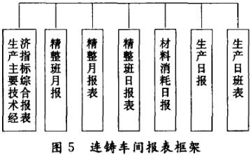 连铸车间报表包括:生产主要技术经济指标综合报表、精整班月报、精整月报、精整班日报、材料消耗日报、生产日报、生产日班报。图5所示连铸车间报表框架。