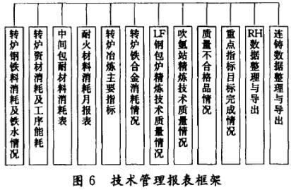 技术管理报表包括:转炉钢铁料消耗及铁水情况、转炉资材消耗及工序能耗、中间包耐材消耗、耐火材料消耗月报、转炉冶炼主要指标、转炉铁合金消耗情况、LF钢包炉精炼技术质量情况、吹氢站精炼技术质量情况、质量不合格情况、重点指标目标完成情况、RH数据整理与导出、连铸数据整理与导出。图6所示技术管理报表框架。
