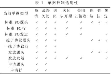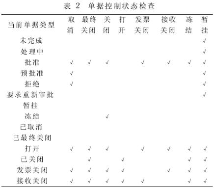 | | 4 单据控制适用性及控制状态检查 表1为申请与标准采购订单允许进行的有效控制活动。  表2为单据控制状态检查情况。  Oracle Purchasing中,不同的单据类型和实体,允许执行的控制活动不同;同一单据类型,不同的状态下,可以执行的控制活动也不同。在选择控制活动时,系统会对单据执行状态进行检杳,核实单据的状态是否有效,来决定是否可以执行选定的控制活动。