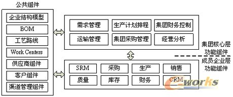 6)其它公共组件:供应商组件、客户组件、渠道管理组件等。对企业集团而言,要考虑企业集的资源互补优势,从全局供应链管理的视角,需要集成各种外部资源,包括企业集团相关的现有供应商、潜在的合作伙伴以及国内外与集团相关的各种资源(如设计研发实体及合作水平、外协企业生产能力、供应能力、分销渠道、第三方物流资源等),供应商组件、客户组件、渠道管理组件为此提供相应支持。