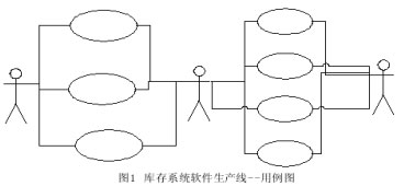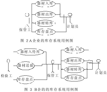图1是我们定义的一个库存系统软件生产线的用例图。该用例图中的可变点定义引入了"可选用例"和"可选角色"两个范型。图2和图3分别是依据该库存软件生产线生成的两个实例应用系统:A企业的库存系统用例图和B企业的库存系统用例图。