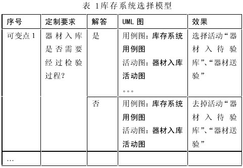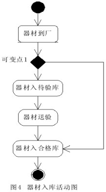 对于软件生产线,它的可变点存在于从需求分析直到设计、实现的各个阶段。例如:两个制造企业都要完成器材的出入库的功能,但是,某个企业在器材入合格库之间需要首先进入待验库,而另一个企业则无需经过器材检验的步骤。这种系统层的可变点通过标准UML语言无法实现。软件生产线的可变点描述既要实现同一产品族系统的集成,又要清晰地表现同一产品族内单个系统之间的可变性。