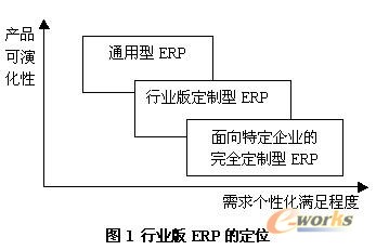 行业版ERP定位于通用版ERP与完全定制型ERP之间,具有通用版ERP的版本可继承性特征,又具有完全定制型ERP产品的行业针对性特点,行业版ERP又不是面向特定企业的完全定制产品,它面向特定行业的企业群体,对目标行业的管理个性化特点进行了抽象,同时又尽可能复用通用产品所提供的行业通用的管理模块,因而行业版ERP具有有形产品行业的产品大规模定制特点。定制满足客户个性需求,大规模实现了规模经济。行业版ERP基于同样的哲理:针对行业的个性化管理需求,面向特定行业或相似行业的企业群体而批量定制。