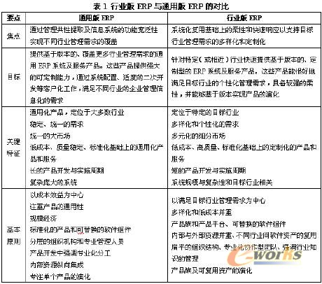 行业版ERP的关键特征为定位于特定的目标行业、产品多样化和个性化的需求,多元化的细分市场,低成本、高质量、标准化基础上的定制化的产品和服务,短的产品开发与实施周期,系统规模与复杂性和目标行业相关。行业版ERP与通用版ERP的对比见表1。