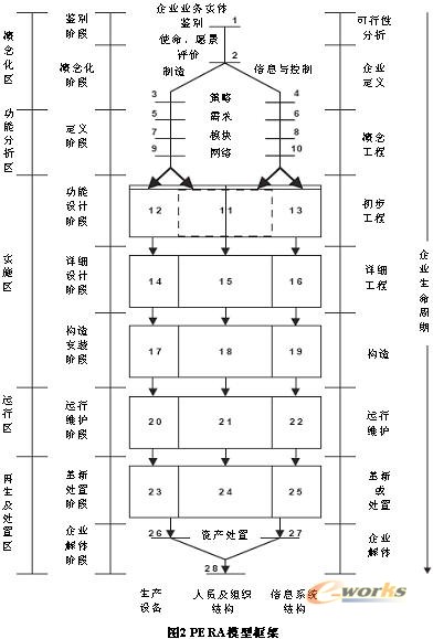 PERA(见图2)是由美国Purdue大学应用工业控制实验室于1990年12月开始开发的,它试图为基于CIM的企业提供一套企业建模的框架及方法学。它支持企业设计的全生命周期建模,并在各个阶段中提供对人员及组织因素的处理方法,提供了各阶段的信息模型,给出了对各类接口进行分析的方法指导。但是,到目前为止,PERA描述复杂系统的能力有待进一步研究,另外,还没有标准软件能够支持PERA结构的建模和分析[2]。