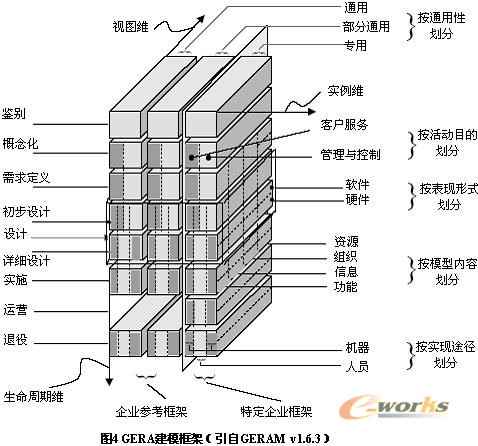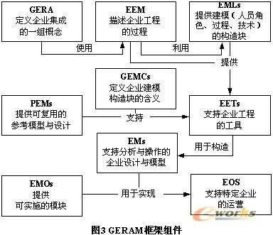 GERAM[6]是IFAC/IFIP企业集成框架任务组在对现有企业集成框架(CIMOSA、GRAI/GIM、PERA)进行评价的基础上开发的通用化的企业参考框架与方法学。它提供了一组用于企业工程及信息集成的通用概念,定义了可用于特定建模工具及方法必须满足的一组标准。GERAM包括一组紧密联系的组件,见图3,包括:通用企业参考框架组件(GERA)、企业工程方法学组件(EEMs)、企业建模语言组件(EMLs)、通用企业建模概念组件(GEMCs)、企业参考模型组件(PEMs)、企业工程工具组件(EETs)、特定企业模型组件(EMs)、企业模块组件(EMOs)、特定企业运行系统组件(EOSs)。GERA建模框架见图4。