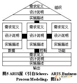 ARIS是德国Scheer教授提出的一种面向过程的、集成化的信息系统模型框架。ARIS结构是从过程链模型抽取、发展而来的。在ARIS概念中,“过程”是由起始事件和终止事件定义的。过程的对象可以是物质的转变过程,也可以是信息的转变过程。在ARIS结构(见图5)中,控制视图是ARIS区别于其它建模框架的重要特征,被用来记录和维护数据视图、组织视图和功能视图之间的关系,而组织、数据、功能视图的发展过程是相对独立的;面向系统的生命周期,ARIS定义了需求定义、设计说明和实施描述三个建模层次。为减少结构的复杂性以及冗余,ARIS还对过程链模型做了简化,更加关注信息的转变,舍弃与信息过程无关的因素,利用分阶段的或者程序化的模型来减少描述视图相互之间的关系。例如:真实的物质转变过程、物质转变过程中人的行为、所需的物料及设备,都以“环境条件”的形式出现在信息描述中,从而,从信息过程的角度看,生产过程不再是物料、人力和生产设备的使用,而是生产过程中数据的交换,这个信息过程的操作还涉及:过程计划、能力规划、生产进度控制等。另外,ARIS有一套标准的、可相互集成的软件工具集支持ARIS建模及仿真分析,并可与SAP R/3等ERP商业套件集成在一起,提供BPR、ERP系统实施、企业流程监控及持续改进等一体化的解决方案。从而,ARIS成为目前世界上极具影响力的建模框架。