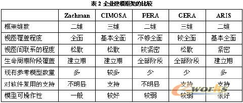 现有的企业模型框架通常采用多个视图、从生命周期的多个阶段、从通用到具体的多个抽象层次等多个维度对企业进行建模。本文认为,视图、生命周期、通用性这三个维度反映了企业最主要的特征,多视图支持从不同角度描述同一个企业对象,支持不同建模人员的任务协同;通用性层次反映了由抽象到具体的过程,便于重用现有的建模成果;生命周期维反映了模型的构造过程。不同的企业模型框架在对各维度的展开程度、建模方法学、建模工具支持等方面存在差异,进而表现为各模型的表达能力、可操作性、模型的开放性及模型实际应用情况的差异。在文献[1]的基础上,本文给出对以上所讨论的各企业框架的比较结果,如表2所示。