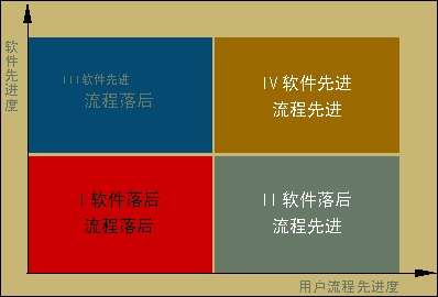 我们将用户流程先进度和软件先进度分别作为横坐标和纵坐标,得到图1。图1根据软件是否先进、流程是否先进可以分为四个象限。下面就对这四种情况进行分析。