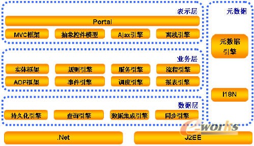 用友UAP ADF开发框架中,第一个是数据层,主要是以对象的方式对流程进行管理,面向SOA架构,它的主架构互联互通。业务实体是业务数据及其封装,用户可以动态控制的规则;通过流程引擎,把服务变成流程。软件是面向服务的,本质上就是由服务组成。在后台,有基于事件的流程,用事件来解决应用层面的问题。流程、调度和报表完成了数据的可视化和系统的监控和系统的扩展。在前端,软件基于门户的方式与用户进行交互,门户里就是每个MVC框架。