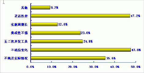 事实上,管理软件第三次革命的发生是必然的,是用户和管理软件提供商共同作用的结果。记者从计世资讯(CCW Research)多年来的用户满意度研究中了解到,在2004年,用户对管理软件的满意度并不高,只有7.37分(满分10分)。更进一步,计世资讯(CCW Research)研究发现,用户对现有应用软件最不满意的前三个因素分别是:不适应变化、灵活性差和不满足企业实际情况。计世资讯(CCW Research)认为,出现这种情况是与中国信息化的基本情况息息相关的。中国信息化现状的典型特征是,已建设的信息系统不是特别多,信息孤岛问题也不是非常突出。他们现在面临的信息化任务,更多地是迫于竞争的压力,建设相应的IT系统来提升竞争力、规范管理、提高效率。他们对应用软件有三个突出的要求:符合自己的需求、建设速度要快、能适应变化。从这三个问题可以现,管理软件不能个性化地满足自己的需求,是用户心中最大的痛。