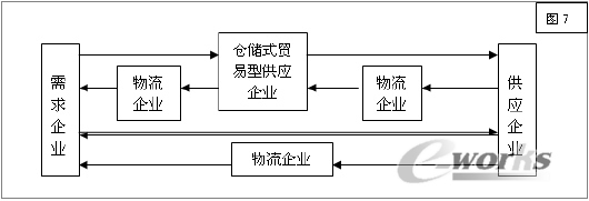 根据企业的基本模型,如果企业实施管理过程自动化时都采用流程驱动型管理模型,企业间的协作和供应关系流程,就可以实现自然对接,那么,企业包括物流企业的管理过程都实现“半自动化”,其整体就形成了网状的一体化企业供应流程链。在理论上,针对某一产品的管理,企业群实现了扁平化管理。但是,由于企业需求的产品是多种多样的,同时企业三大外部环境对企业具有各种限制,实际上,企业的管理将是平而不扁,因此,仓储式贸易型供应商依然是企业供应流程链的一个必要组成部分,它可帮助企业群实现相对的扁平化管理。框图如图7。