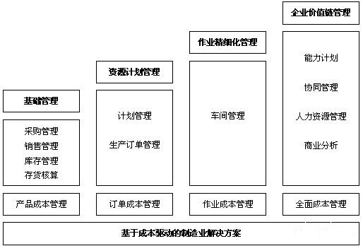 基于成本驱动的ERP管理模式在企业管理改进完善过程中设定恰当的改进目标,将企业成本控制和管理的实施与ERP业务系统实施的全过程贯通。在实施的每一阶段,通过对不同层次的成本管理,使每一阶段实施目标明确,业务改进有的放矢,使得企业成本领先优势战略逐步得到实现。