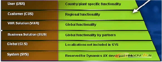 AX利用先进的层技术来保证系统的升级和客制化版本控制,如图7所示,AX按级别高低把代码分成五个层,每一层都是由下一层集成而来的,所以保证的代码的一致性得到保证,同时还可以有效地进行灾难恢复。