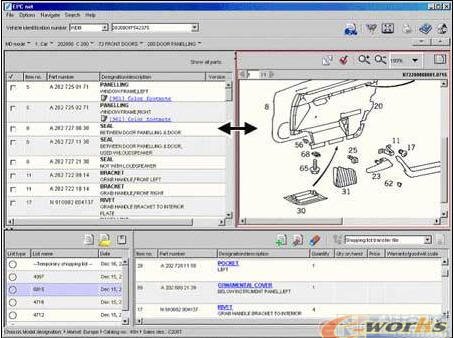 EPC(Electronic Parts Catalog)是电子版零配件手册。一辆汽车有上千种零配件,EPC可对车辆的各个零部件实现图形化的查询。在系统中输入车型就可以显示汽车的三维模型,对汽车结构进行拆解式全方位显示,用鼠标选择所需要的零件,零件号会自动显示在DMS中,还可把该零件自动放入"购物车"中。 EPC同时是一个庞大的车辆配置数据库,公司在全球销售的每一辆车的配置信息都可以系统中查询到。如下图所示,在EPC中输入汽车底盘号码,该辆车的出厂配置都可检索到。下图右半部分显示车辆前门的三维拆解图,左半部分可列出所有对应的配件号和描述信息等:
