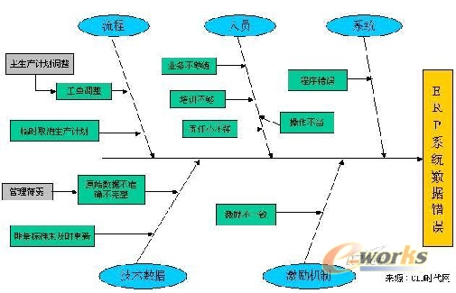 王涛不敢怠慢,为了找出产生错误的数据信息的深层原因,他组织IT部门员工对错误原因利用鱼骨图进行了初步分析,进过分析发现产生错误的原因主要有如下几个: