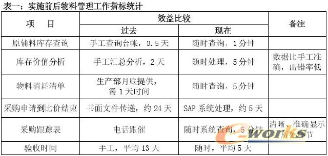在物料管理方面,原来需要以“工作日”为时间计量单位的工作,现在基本上都以“分钟” 为时间计量单位,而且结果显示直观而精确(分析结果见表一)。