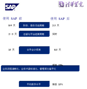 | | 高度重视知识转移和应用:通过电话会议的形式在项目的每个阶段都进行了大力度、大范围的培训。所有的培训都有统一教材、考试、颁发上岗证等,确保培训质量。采用了新的技术手段,通过屏幕拷屏和录象的方式完整、系统地准备培训的录音、录象资料。通过"原汁原味"的、"统一"的培训资料,保证了异地用户培训的效果。因此,外部顾问和内部顾问没有去外地进行任何培训和支持,就完成了全国外地10个平台的上线培训和支持。凭借诸多成功的关键要素,在短短四个月的时间内,紫光的系统实现了:共31个公司代码,93个利润中心,204个成本中心,162个新增报表,94张单据,230个销售区域,15个信贷控制范围,工厂15个,库存地194个(上述概念均为SAP概念)。而且,最为重要和困难的是,整个系统的实施覆盖全国11个销售分支机构,是全国范围内的一次性、整体上线。 在业务方面,紫光各事业部与10个外地销售公司实现了一次性同时上线,这在ERP实施的历史上也是极少的,因为用户培训和知识转移方面要花费大量的精力和时间,在4个月内完成更是创记录的。在技术上,系统实现了外地销售公司每发生一笔销售业务后就会与总部的事业部实现自动结算。因此,股份公司与外地销售公司所有的业务发生都能做到了同步、自动化,保证数据的实效和准确,真正实现了"实时"。 在系统内,实现非常复杂的销售价格管理和精细化的信用管理,在库存管理上,同一种物料可以区分成多个批次的不同成本,并严格管理退回库存。在用户权限管理上,也实现了精细化的权限控制。彻底实现了财务、商务、销售之间、总部与分支结构之间、管理层与运作层信息的"实时共享"与"高度集成",彻底消灭了信息孤岛,实现了"紫光人都讲国语的目标"。 紫光ERP项目的成功不仅仅是一个信息化系统的成功。作为紫光企业战略和管理变革当中的一个重要的、不可或缺的环节,ERP项目的成功同时体现了企业战略调整的成功。 紫光不平凡的信息化建设历程,14个月,管理咨询、平台改制、SAP上线,环环相扣,步步为营,使我们看到了中国本土企业对信息化的深刻理解和真正应用,也看到了管理变革的章法与气魄,而这里ERP扮演了最重要的角色! 使用的mySAP.com方案: FI 财务会计CO 管理会计MM 物料管理SD 销售与分销 技术环境:(待确认) 平台:HPX86服务器操作系统:Windows2000AdvancedServer 附:清华紫光在SAP上线前后的一些变化