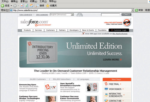 2004年7月,Salesforce刚上市时,股票交易价为11美元。最近一个月,它的股价则在40美元附近徘徊。成立7年多的Salesforce.com在全世界的2.48万个公司拥有超过50.1万个用户,并以每年80%的速度增长,客户满意度高达97%。