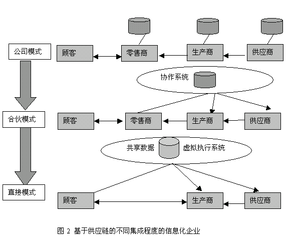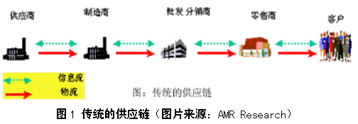| | 在企业的经营活动中常常遇到这样的情况:从原材料到产成品需要数天,数月时间,而制造时间仅仅是几分钟,几个小时;零售商的库存一般在10周左右,而制造商具有每周的制造能力;经营者总是评价生产的价值,而不是满足客户的需求;总是觉得需求不准确,需求与供应总是不匹配;等等。这些问题主要源于不科学、不优化的供应链管理。如,食品工业的领头羊Nabisco公司1997年由于它迟缓的改革和将近两个百分点的销售下滑,而使华尔街大失所望,问题在于公司的供应链没有实现集成:烤制食品部的供应链由一个系统组成,而供应部的供应链则由另一个系统组成,致使货架空空,零售商很不满意。 我们知道,企业内部存在着物流、信息流、资金流的流动,企业与企业之间也存在着这样的流动关系。在日趋分工细化、开放合作的时代,企业仅仅依靠自己的资源参与市场竞争往往处于被动。必须把同经营过程有关的多方面纳入一个整体的供应链中,这样每个企业内部的价值链就通过供应关系联系起来,成为更高层次、更大范围的供应链。从拓扑结构来看,供应链是一个网络,即自主或半自主的企业实体构成的网络,这些企业实体共同负责与一类或多类产品相关的采购、生产并最终将产品送达顾客等各项活动;从运行机制来看,供应链是一个过程,即根据顾客订单,通过原材料供应、存储、产品生产、产品送达顾客的一个物品的移动过程。供应链中的一个节点往往是一个企业或一个场所,节点的上下游通常是与外部企业、外协厂家、企业内的分支机构或顾客等。 供应链一般分为内部供应链和外部供应链。内部供应链是指企业内部产品生产和流通过程中所涉及的采购部门、生产部门、仓储部门、销售部门等组成的供需网络。而外部供应链则是指企业外部的,与企业相关的产品生产和流通过程中涉及的原材料供应商、生产厂商、储运商、零售商以及最终消费者组成的供需网络。内部供应链和外部供应链共同组成了企业产品从原材料到成品到消费者的供应链。供应链管理就是把这个供需的网络组织好。但传统的供应链管理仅仅是一个横向的集成,通过通讯介质将预先指定的供应商、制造商、分销商、零售商和客户依次联系起来,这种供应链只注重内部联系,灵活性差,仅限于点到点的集成,如图1所示。这样,成本高、效率低,而且供应链的一个环节中断了,则整个供应链都不能运行,主要表现在: