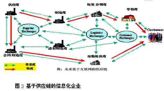 一是由供应链的每一个环节向上游转移,需求的不稳定性增加,预测准确度降低。制造商和零售商发现他们自己淹没在许多物品的库存里,同时,他们也已对某些物品的缺货现象习以为常。 二是他们对新的需求趋势反应迟缓。假如某种商品突然流行起来,并在商店脱销,补货订单到达零售商的配送中心后,配送中心并未采取更多的行动,而是在此商品量降到最低库存水平,才向制造商发出订单。接下来,制造商在其配送中心的库存降到订货点时订货,然后,生产计划部门开始计划新的生产。整个体系将无法及时抓住此次销售良机。传统体系由于采取沿着供应链向上游逐级转移的订货程序,没有和潜在的消费需求及时沟通,所以,往往无法做到更快地向市场供应产品。 三是管理者对所有产品种类的管理抱着一视同仁的态度,对变化的与稳定的品类保持同样的库存水平,销量大的品类和销量小的品类也都采取同样的物料处理方法。这样一来,减少分销成本的机会就丧失了。 以上问题可以通过实施供应链管理(SCM—Supply Chain Management)系统加以解决。 我们知道,企业的经营主要涉及以下三个方面:一是生产,优化生产过程、降低生产成本和提高工作效率;二是为客户提供优质的服务、改善与客户的关系;三是建立与供应商、分销之间快速的合作与交流渠道。第一方面是ERP的主要内容;第二个方面是CRM的主要内容,而第三个方面即是SCM的主要内容。SCM主要是企业从采购到销售,去掉中间的生产优化和客户关系(如签定合同等)以外的所有东西。当然,这三个系统会有所交叉。 作为一种新的思想、模式和软件应用系统,SCM是围绕供应商与需求商之间的物料流、信息流和资金流所进行的计划、协调与控制过程。SCM主要包括计划、合作和控制从供应商到用户的物料(包括零部件和成品等)和信息。供应链管理系统的目标有多方面,主要包括:使成本最小化,提高服务水平,改进供应链成员企业之间的通讯,通过配送和响应时间来增强柔性等。实施SCM管理模式可以帮助企业在正确的时间、正确的地点,以最低的成本提供正确数量的合格原材料、零部件和产品。这是一种“共赢”的局面—包括供应商、生产商、销售商在内。主要实现了以下转变: (1)从功能管理向过程管理的转变。传统的管理将供应链中的采购、制造、市场营销、配送等功能活动分割开来、独立运作,而这些功能都具有各自独立的目标和计划,这些目标和计划经常冲突,供应链管理就是达成这种一致和协调的机制。不仅在企业内部要向过程管理过渡,在企业外部,管理供应链上游、下游的各个合作伙伴的业务活动,也需要从功能管理向过程管理过渡。 (2)从利润管理向赢利性管理转变。企业到底追求的是利润还是赢利性?传统的管理将利润作为企业管理的重点,但现代管理认为利润管理还是很粗放,因为利润只是一个绝对指标,用绝对指标衡量企业的经营业绩是不具可比性的,应该用相对指标来衡量企业的经营业绩,而赢利性就是一个相对指标。所以,国外企业界现在强调要进行赢利性管理。这种赢利性是建立在“共赢”基础上的,只有供应链各方均具有较好的赢利性,企业自身的赢利性才有可能得到保证。 (3)从产品管理向顾客管理转变。在买方市场上,是顾客而不是产品主导企业的生产、销售活动,因此顾客是核心,顾客是主要的市场驱动力,所以顾客的需求、顾客的购买行为、顾客的潜在消费偏好、顾客的意见等都是企业要谋求竞争优势所必须争夺的重要资源。而顾客是供应链上重要的一环。在买方市场上,供应链的中心是由生产者向消费者倾斜的,顾客管理就成为供应链管理的重要内容。 (4)从交易管理向关系管理转变。传统的供应链伙伴之间的关系是交易关系,所考虑的主要是眼前的既得利益,因此不可避免地出现供应链伙伴之间为了自身利益而牺牲他人利益的情况。现代管理理论认为,可以找到一种途径,能同时增加供应链各方的利益,这种途径就是,要协调供应链成员之间的关系,以协调的供应链关系为基础进行交易,以使供应链整体的交易成本最小化、收益最大化。 (5)从库存管理向信息管理转变。企业对待库存的心理一直都十分矛盾,一方面库存是财富,必须拥有;另一方面库存又是成本和累赘,必须尽可能摆脱。企业因为库存积压苦恼过,因为商品短缺着急过。在供应链成员之间,一会儿排斥库存、一会儿囤积库存,造成巨大浪费。我们是否可以从另外的角度去考虑问题:用信息代替库存,也就是企业持有的是“虚拟库存”而不是实物库存,只有到供应链的最后一个环节才交付实物库存,那不是可以大大降低企业持有库存的风险吗?因此,用及时、准确的信息代替实物库存就成为供应链理论的一个重要观点。 至此,我们可以一个从供应链管理的角度勾画出一个信息化企业,其集成程度经历了不断增强的过程:从以企业本身为重点的模式(Nabisco),到协作型的模式(P&G),再到直接型模式(Dell),如图2所示;最后到集成型模式,如图3所示。