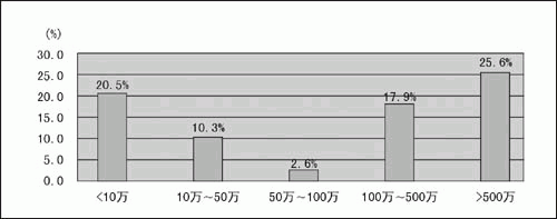 资料来源:中国物流信息中心(2004.4)  被调查企业信息化总计投资额(调查企业样本总数为103家)