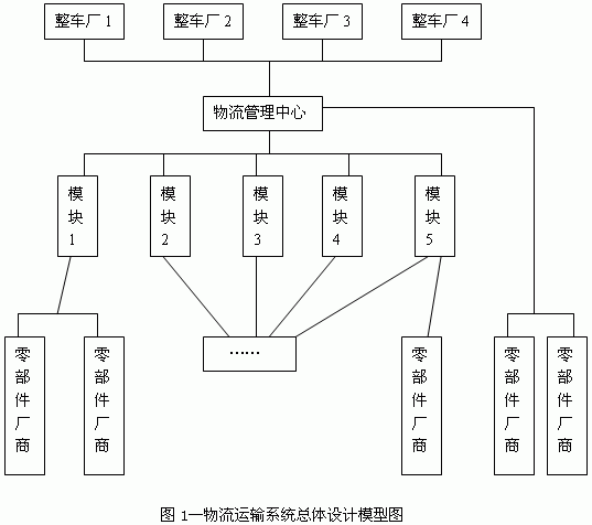 以上我们对汽车零部件物流运输系统设计原则进行了讨论,并参考国内知名的大型汽车集团物流管理方案,为零部件物流运输系统的模型设计提出了前提和方案。汽车零部件有上万种类,现在国内普遍采用模块化的方法进行大的分类,便于实施物流管理。比如某集团已形成底盘、内饰、电子电器、动力传动、空调、热加工的六大模块,“模块化”供货已经初步形成。根据设计的一些原则和汽车制造企业的布局,对零部件物流运输系统总体设计模型如下