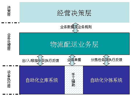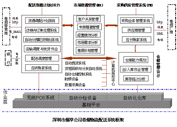 4、3、1、设备执行层 设备执行层的核心是自动化立体仓库和分拣系统。自动化立库系统由7128个货位、6台巷道堆垛机、5台机器人、控制系统、调度系统、和信息管理系统构成,采用两台IBM服务器构成双机热备份系统。物流配送业务层的出库、入库、移库、补货指令下达至立体仓库管理系统,由调度模块完成货位、托盘、物流设备的分配任务,自动完成搬运任务并反馈业务系统实际执行情况。自动化分拣设备是按客户订单进行条烟分拣的关键设备,由55台PLC构成的Profibus系统构成,系统核心是分拣控制计算机,上联后台数据库系统,下接Profibus网,负责将订单数据转换为分拣任务指令下达至PLC执行。 4、3、2、业务处理层 业务处理层由配送资源需求计划(DRP)管理、市场资源(MR)管理、仓储(RS)管理、采购供应(PM)管理四大部分构成,各部分间有紧密的集成关系。 配送管理分为补货、访销、自动分拣配货、送货作业管理、配送资源管理、运输调度管理等功能,主要依据访销订单信息,进行出货批次调度、制定配送计划及下达分拣任务,结合出库批次及车辆资源进行送货的优化运输调度。 市场资源管理提供客户关系管理、专卖管理、经营绩效管理、市场需求分析。采购供应管理提供采购业务的处理,供应商信息管理等。 仓储管理主要完成卷烟的入库、检验、出库、退库、库存统计及库存分析以及卷烟的仓储能力规划等功能,该部分主要以自动化立体仓库为核心。 同时四部分之间又存在着非常紧密的联系,订单数据是制定配送计划的主要依据,采购计划制定主要依据库存和销量统计。电子商务功能紧密地融合在订单接收、采购管理、供应商及客户关系管理、会计结算、经营及绩效管理等业务中。系统设计支持向国家局金叶信息系统的数据上报。深圳市烟草公司卷烟供应链配送系统的结构如下图所示。
