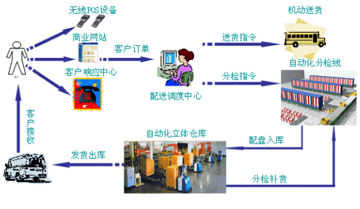 4、4、1、订单采集 系统提供多种订单采集途径并行运作的方式进行卷烟销售业务,目前主要使用的是主动上门访销的方式,访销人员将客户订单通过无线POS系统实时发到物流配送中心,通过专用网关进入数据库系统。客户响应中心主要采用电话访销的方式主动联系客户,电话访销员输入的订单也实时进入订单系统。网上配货主要面向拥有信息系统的大客户,通过获取客户的销售、库存状况,主动为客户进行补配货。 4、4、2、配送调度与订单处理 配送调度是进行补货、分拣、送货的核心业务,订单收集以后,系统依据预先定义的客户类别对订单进行分类,对紧急订单要进行实时配送。对于一般订货,要首先通过订单汇总出补货计划,分批次下达到立体仓库管理系统进行补货作业。系统依据订货的任务量在5条分拣线间进行合理的分拣能力优化,保证任务均衡,同时按客户的送货区域、送货顺序等进行分拣排程形成分拣任务,分拣任务实时下达至自动化分拣系统进行分拣,分拣完成后自动分拣后卷烟配盘入库。 4、4、3、配送出库与网上结算 分拣完成后,系统自动生成配送出库单及送货指导单,同时将送货数据以XML文件的方式通过FTP送至专业物流公司进行送货。送货过程中送货员用无线POS系统与银行进行结算业务,同时送货数据实时反馈至后台信息处理系统进行销售、毛利等的统计。送货结束后,系统自动获取网上银行的对帐数据进行对帐业务。